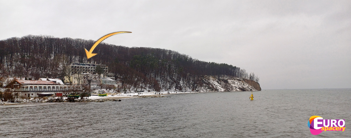 Widok na klif orłowski. Strzałka wskazuje opuszczone sanatorium „Zdrowie”